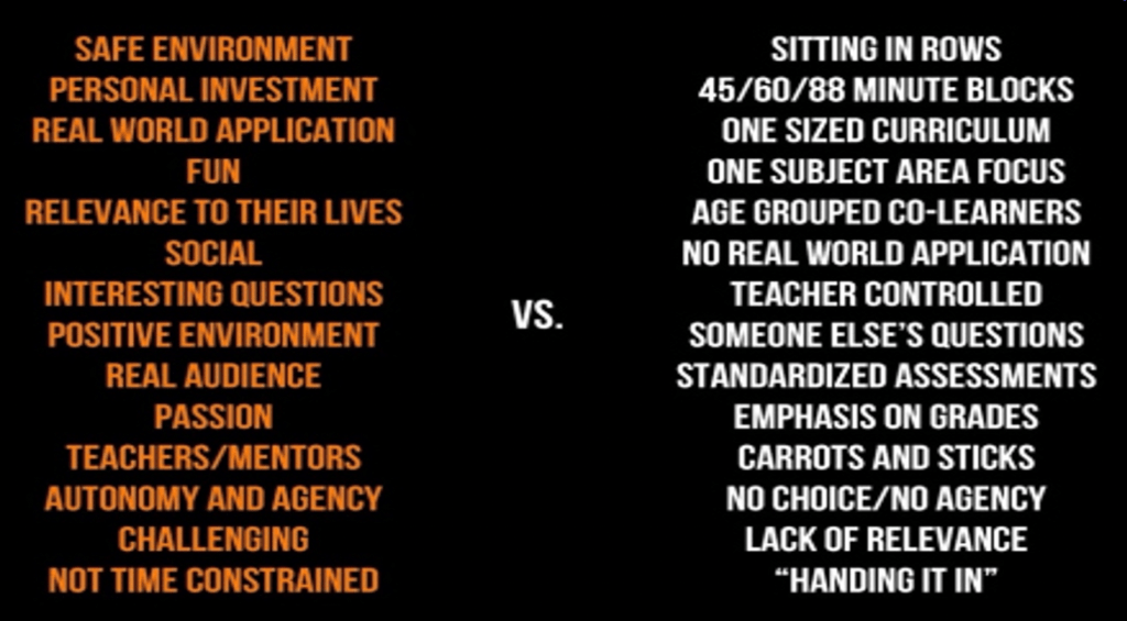 Will uses this visual to showcase some of the elements of deep, meaningful learning (social, not be constrained by time, real audience, real world application). As he states in his TED Talk, we know what deep meaningful learning looks like because we have all experience it – whether it be learning a language, a new hobby, or a skill. Yet, we rarely construct schools and classrooms around these same principles. Instead, we construct classroom environments that emphasize “teaching” (compliance), rather than “learning” (exploration). So if we want students to be engaged and invested in their work, let’s amplify the characteristics we know lead to meaningful learning.